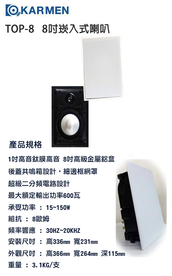 KAR MEN TOP-8 8吋 高音質崁頂喇叭(二支裝)