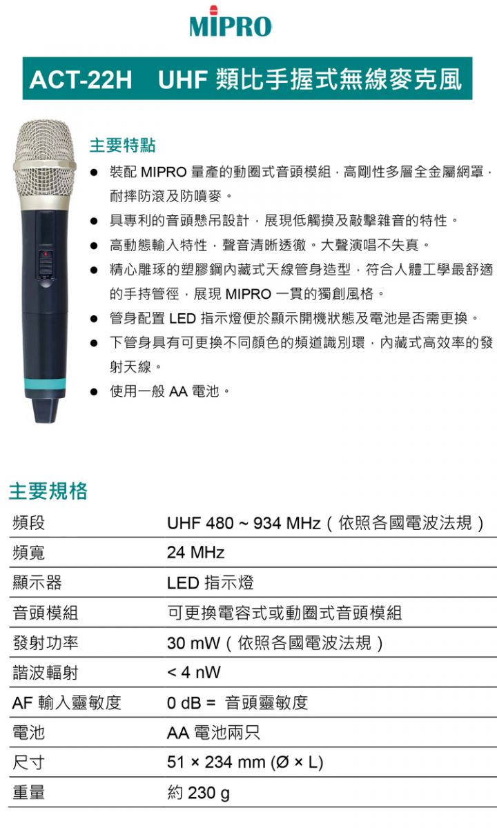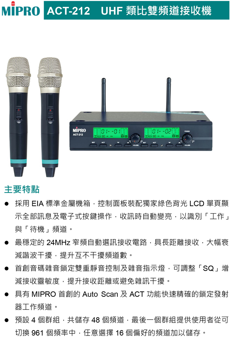 MIPRO ACT-212 配ACT-22H 手握式無線麥克風(UHF類比雙頻道無線麥克風 嘉強公司貨保固一年)
