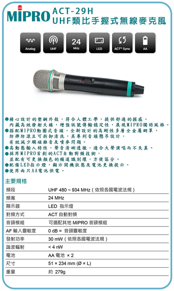【MIPRO】ACT-289 雙頻道UHF無線麥克風 (ACT-29H/MU-80III)