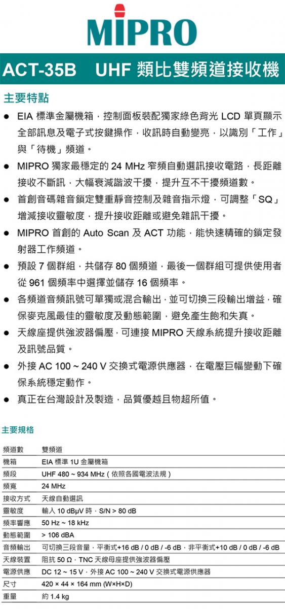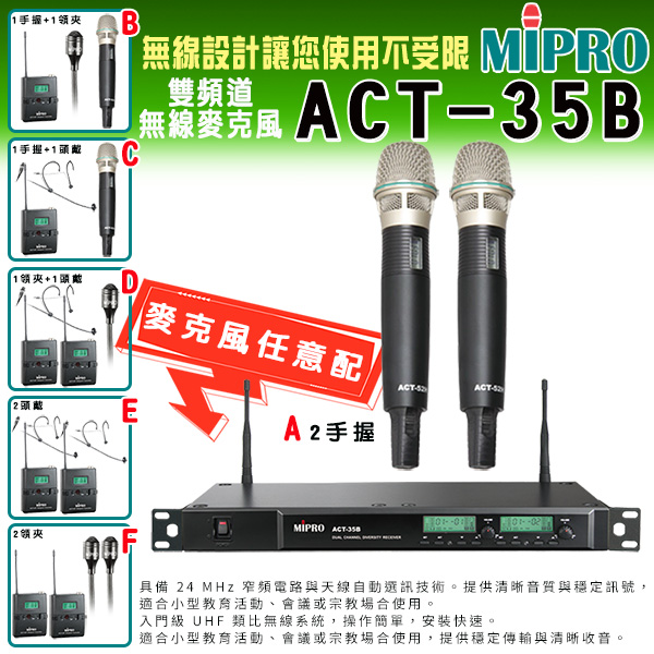 MIPRO ACT-35B 類比雙頻道無線麥克風(ACT-52H/MU90 配件六擇一)
