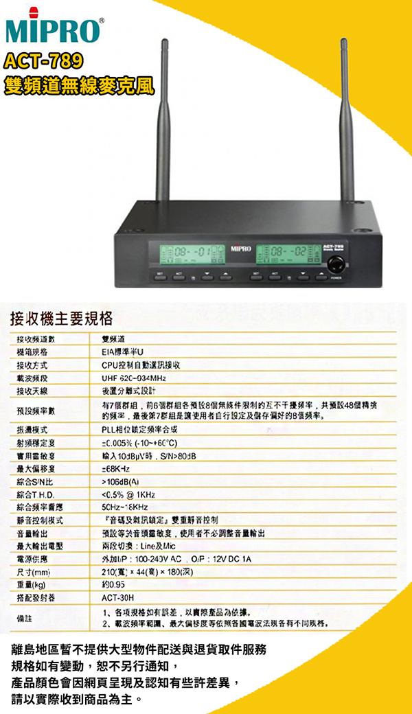 永悅音響 ACT-789 雙頻道無線麥克風 (ACT-32H/MU90配件六擇一)