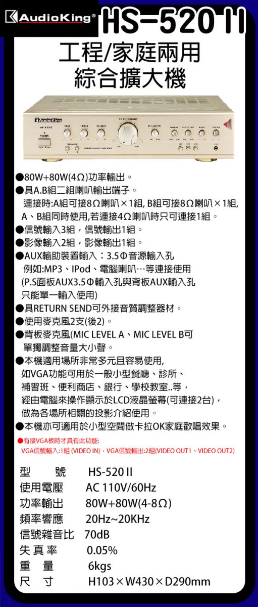 Audioking HS-520Ⅱ(工程/家庭兩用綜合擴大機 80W+80W)