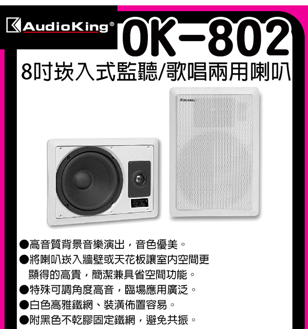 Audioking OK-802 白色一對(8吋崁入式監聽/歌唱兩用喇叭)
