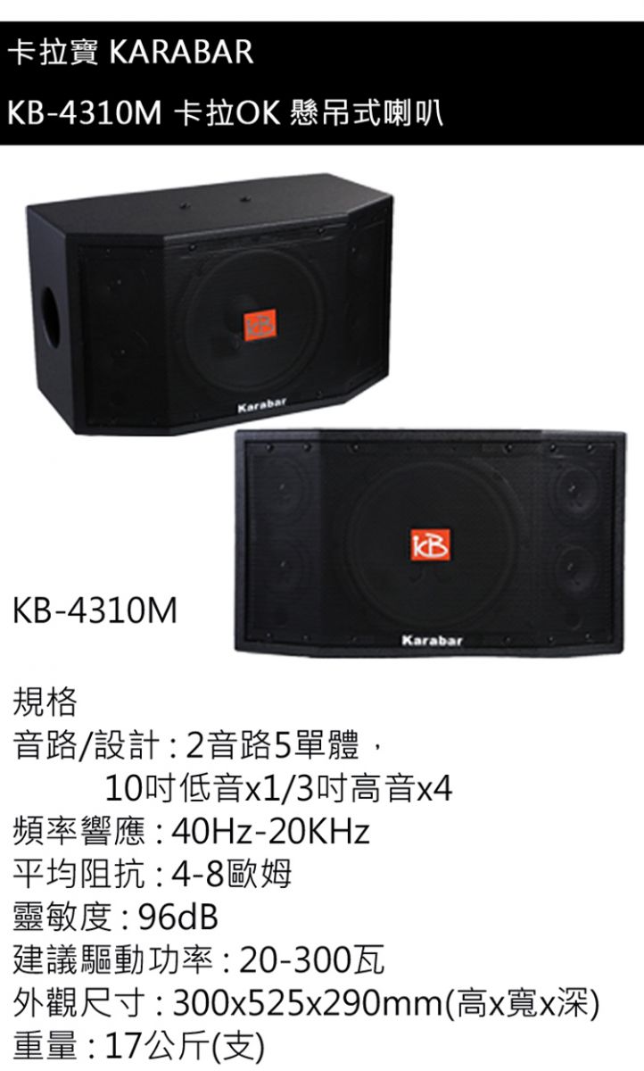 永悅音響 KARABAR KB-4310M卡拉OK喇叭(對)全新公司貨(免運)