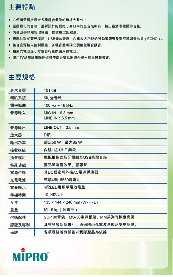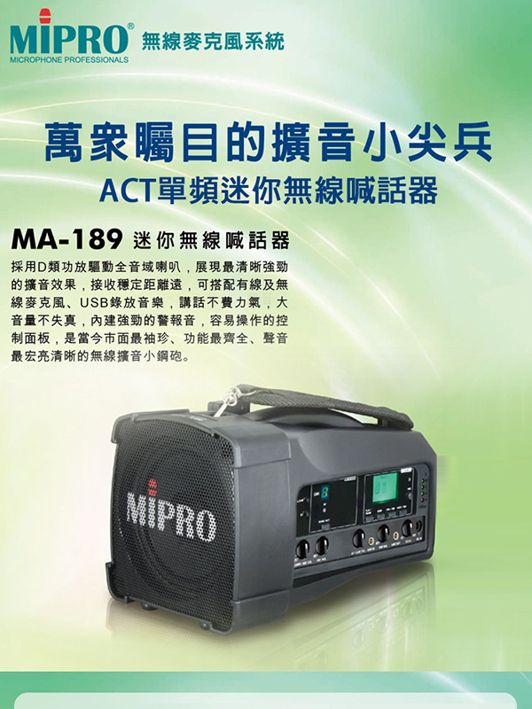 【MIPRO】MA-189 UHF單頻道迷你型無線喊話器 (ACT-32H 配件三擇一)