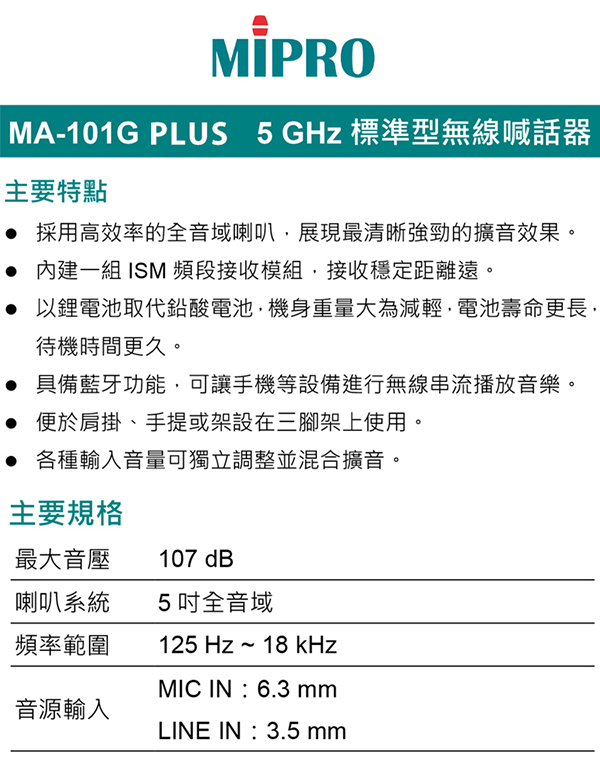 【MIPRO】MA-101G PLUS 標準型單頻道5 GHz無線喊話器 (ACT-58H 配件三擇一)