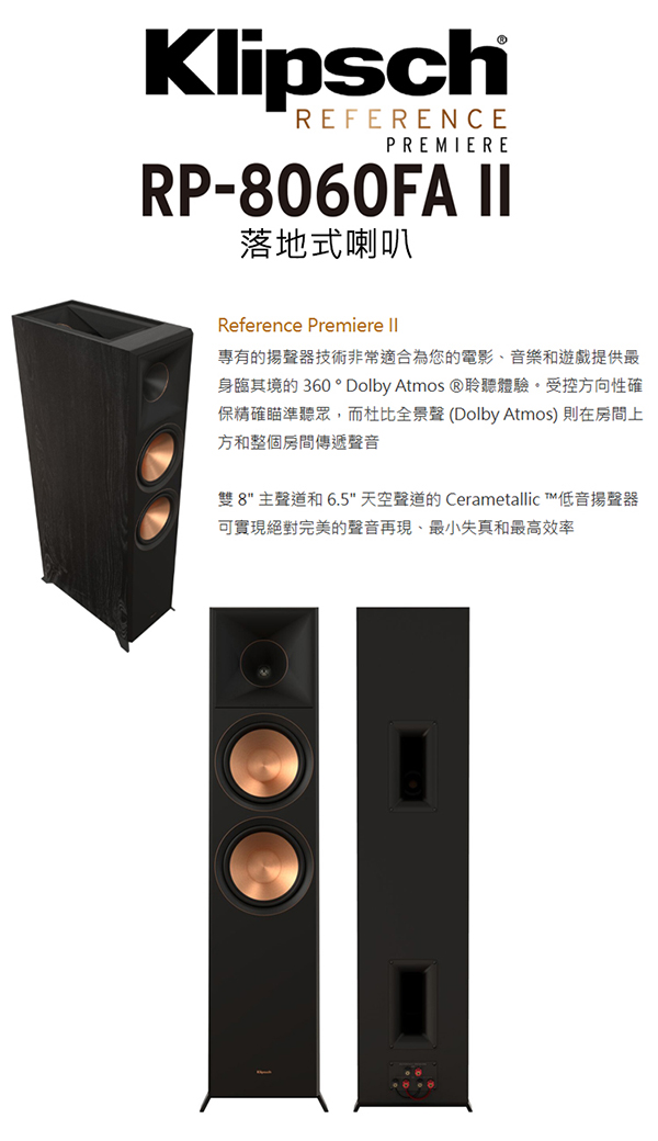 Klipsch RP-8060FA II 落地式喇叭一對(Reference Premiere II 釪環公司保固