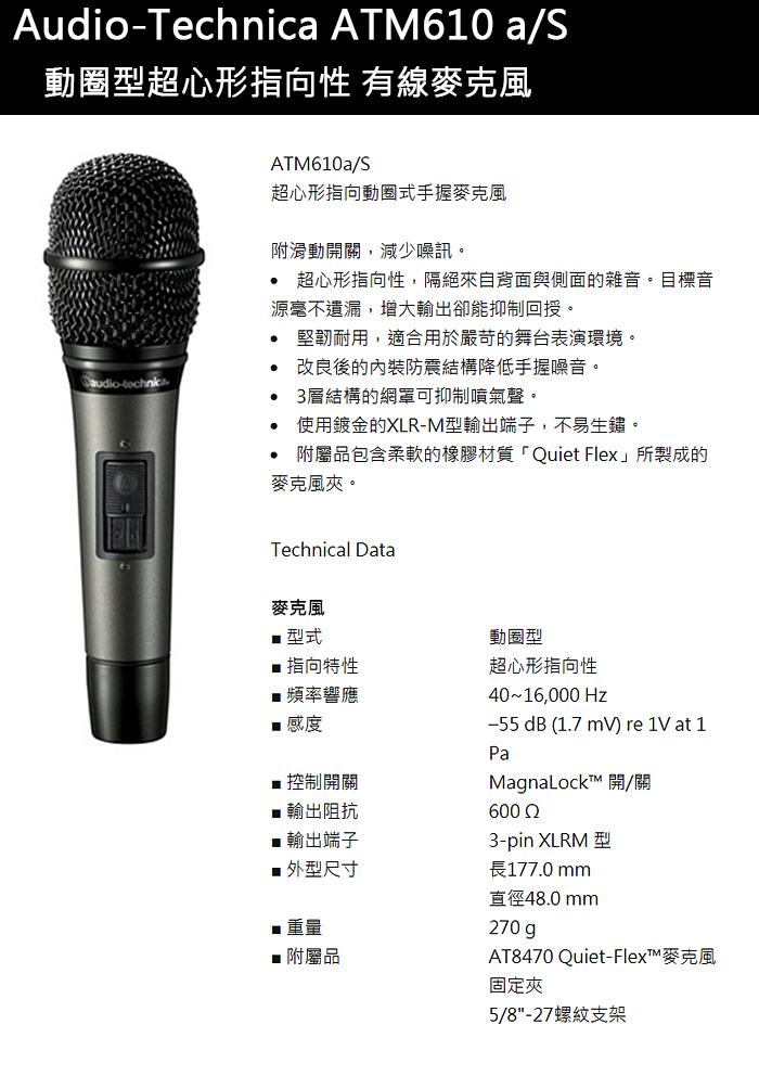 永悅音響 audio-technica 鐵三角 ATM610a/S 動圈式有線麥克風含麥克風線 (免運)