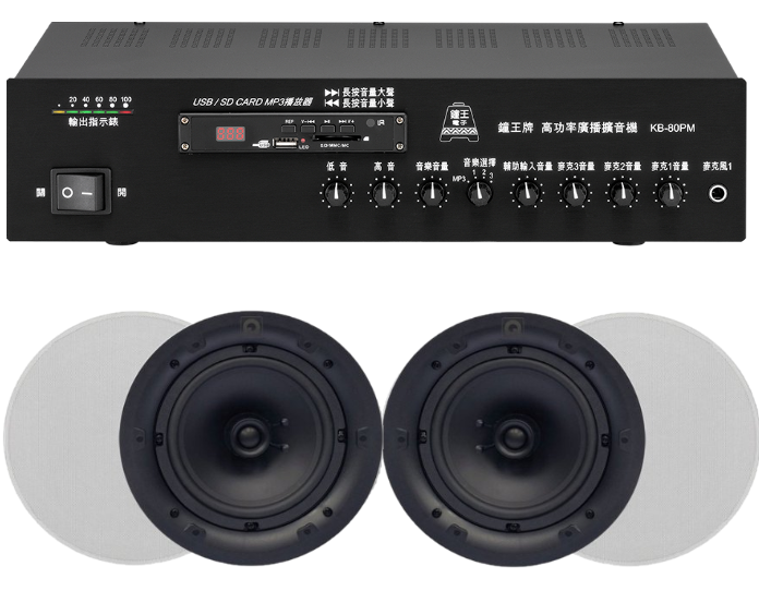 永悅音響 鐘王牌 KB-80PM+AV MUSICAL HSR-108-6T 專業廣播用擴大機+崁入式喇叭4支
