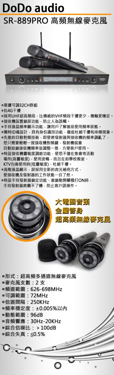 永悅音響 DoDo AUDIO SR-889PRO專業無線麥克風(單邊32CH調頻)全新公司貨 (免運)
