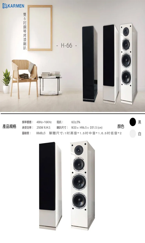 KAR MEN H-66 雙6吋鋼琴烤漆落地喇叭(白/一對)