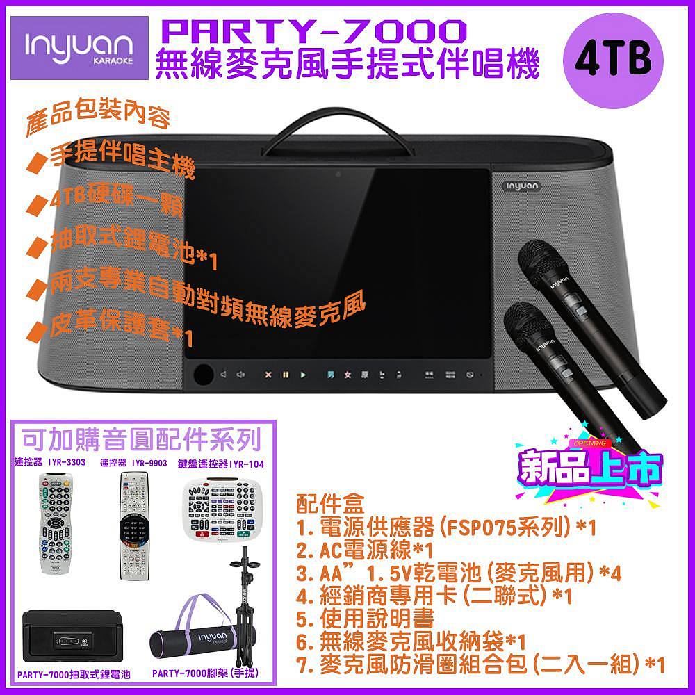 永悅音響 音圓 PARTY-7000無線麥克風手提式伴唱機(內建4TB硬碟/鋰電池.含兩支麥克風及皮革保護套*1)