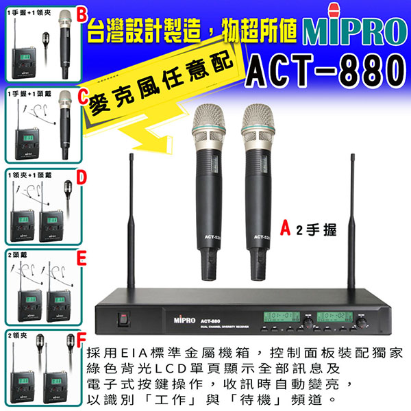 MIPRO ACT-880 雙頻道無線麥克風 (ACT-32H/MU90配件六擇一)