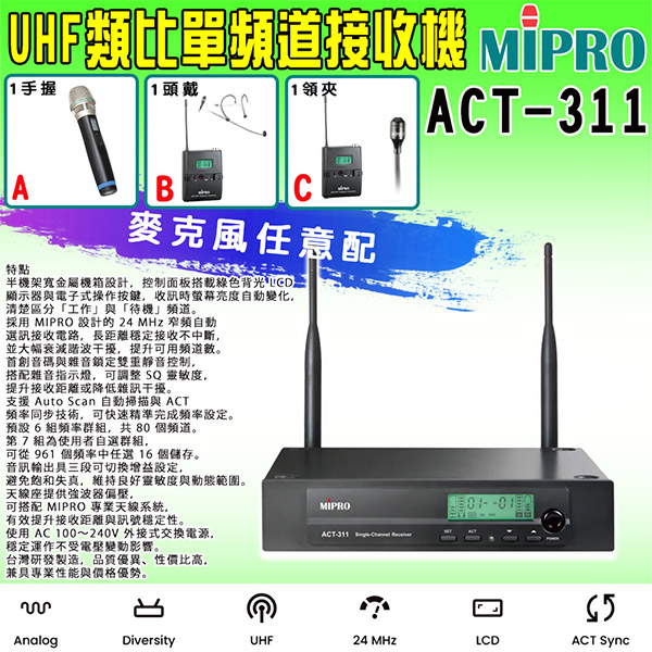 永悅音響MIPRO ACT-35B雙頻道自動選訊無線麥克風(手持+發射器+頭戴式) 全新公司貨 (免運)