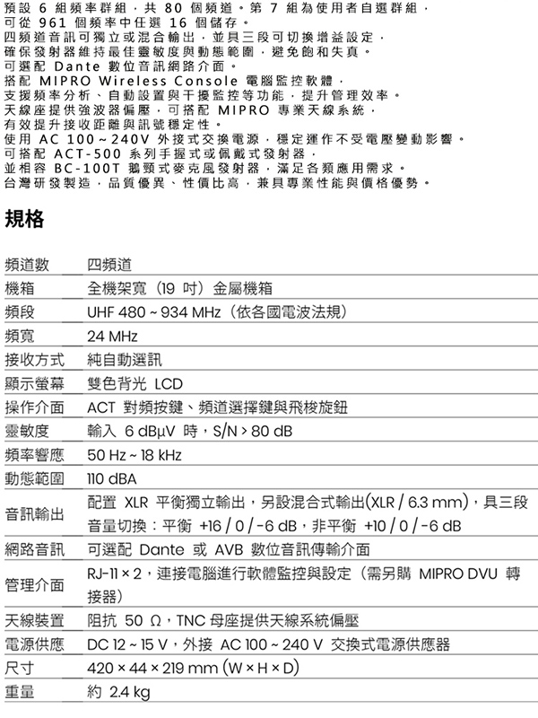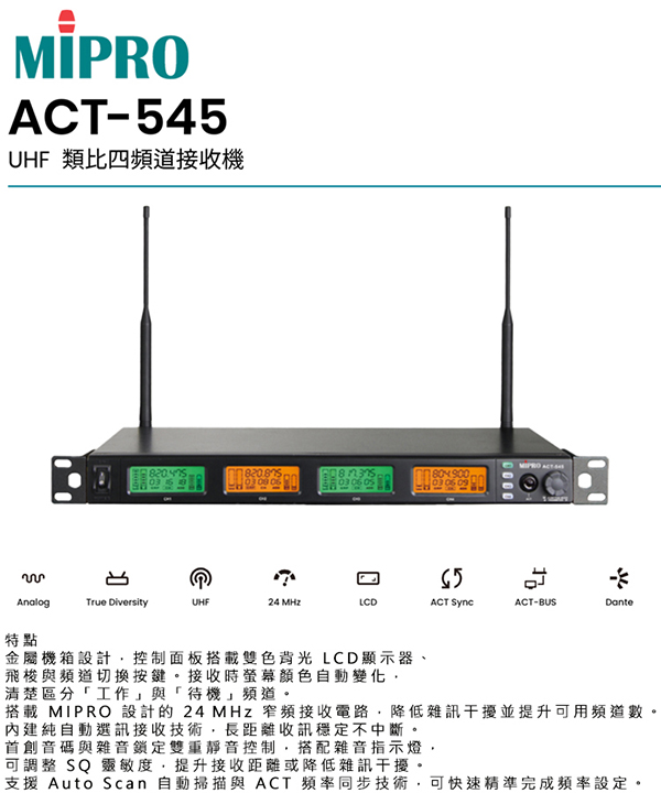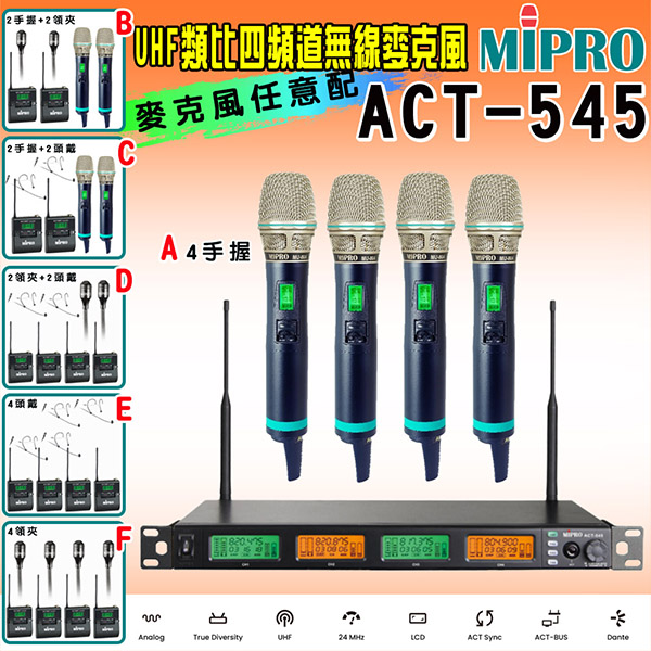 【MIPRO】ACT-545 類比四頻道無線麥克風UHF(ACT-500H 配件六擇一)
