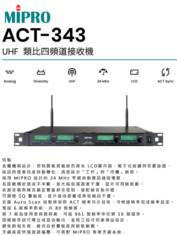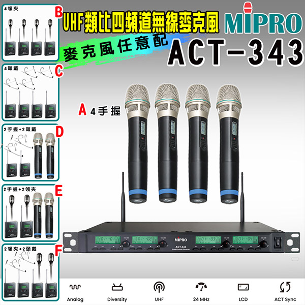 【MIPRO】ACT-343 1U四頻道自動選訊無線麥克風 手握式麥克風ACT-32H(配件六擇一)