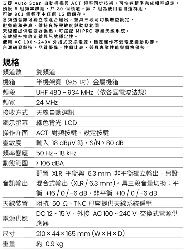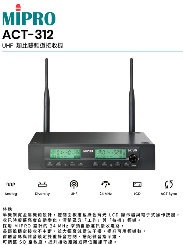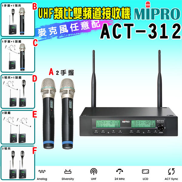 【MIPRO】ACT-312 類比雙頻道無線麥克風UHF (ACT-32H 配件六擇一)