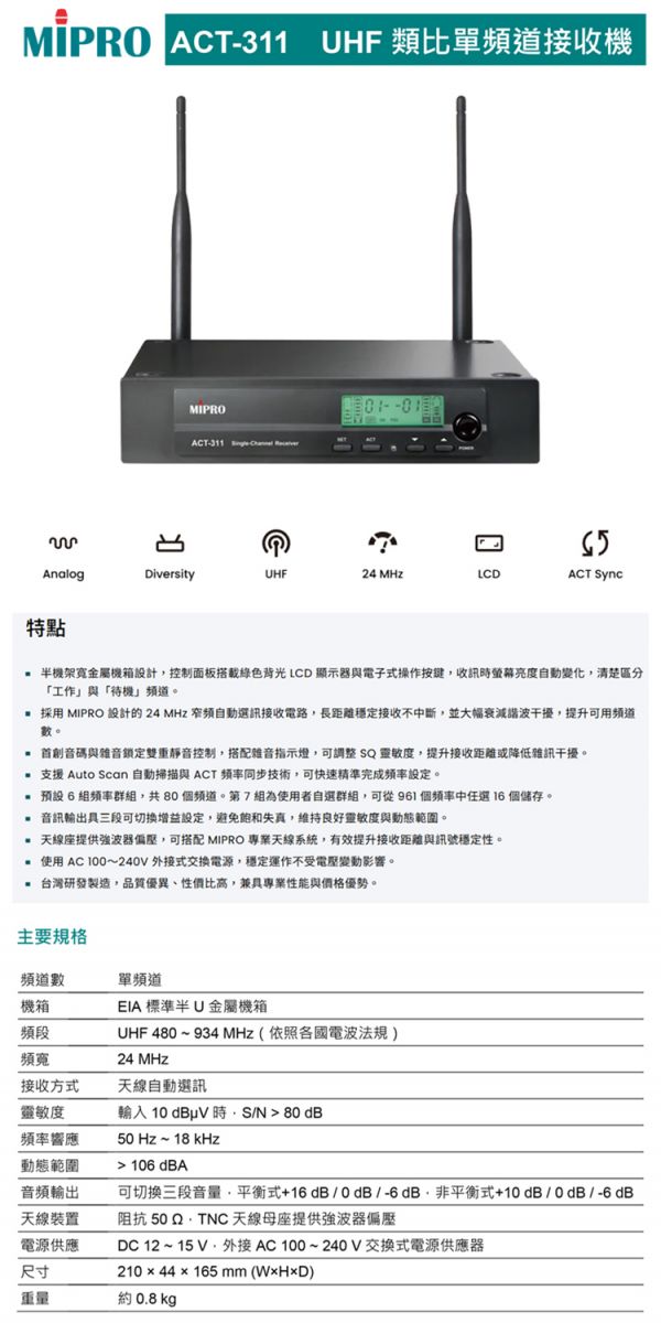 【MIPRO】ACT-311 類比單頻道無線麥克風UHF (ACT-32H 配件三擇一)