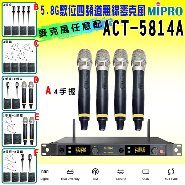 【MIPRO】ACT-5814A 數位四頻道無線麥克風5.8G(ACT-58H 配件六擇一)