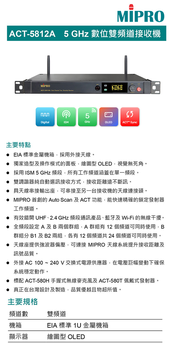 【MIPRO】ACT-5812A 數位雙頻道無線麥克風5.8G(ACT-580H 配件六擇一)