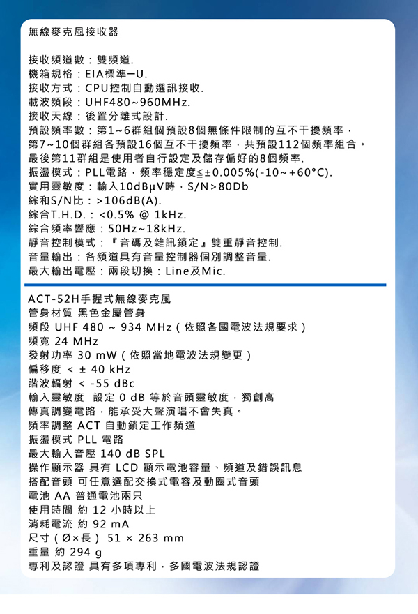 【MIPRO】ACT-668雙頻道無線麥克風 (ACT-52H/MU90)