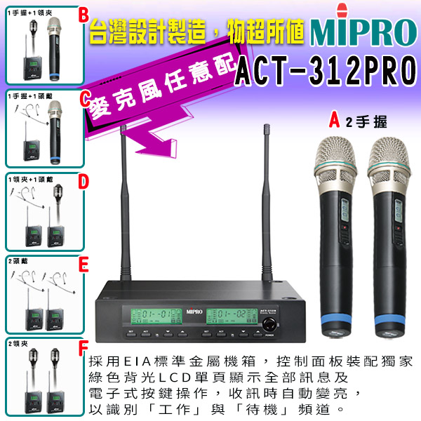 MIPRO ACT-312PRO 半U雙頻道自動選訊無線麥克風 (ACT-32H/MU90配件六擇一)