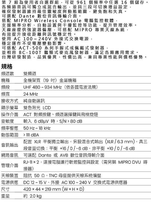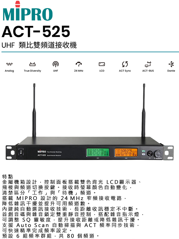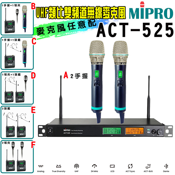 【MIPRO】ACT-525 類比雙頻道無線麥克風UHF(ACT-500H 配件六擇一)