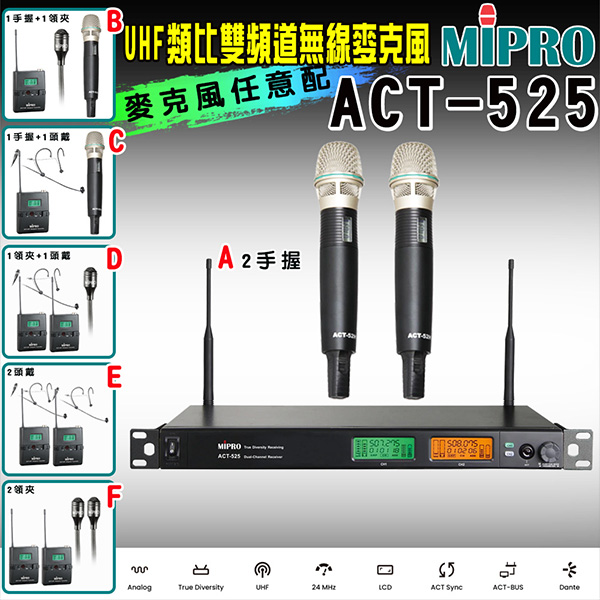 【MIPRO】ACT-525 類比雙頻道無線麥克風UHF(ACT-52H 配件六擇一)