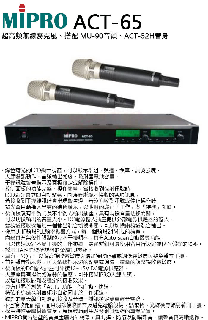 永悅音響MIPRO ACT-65(MU-90音頭) 手持2支無線麥克風組 贈三項好禮 全新公司貨