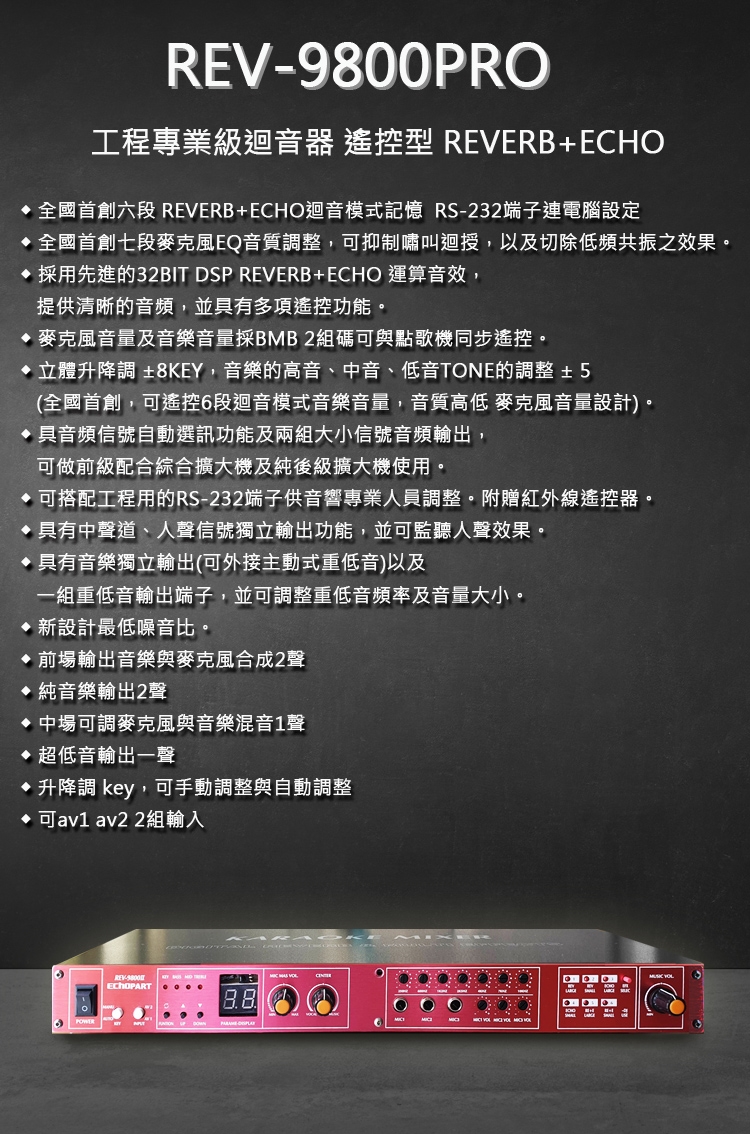 永悅音響 ECHO PART REV-9800PRO 工程.KTV旗艦型麥克風迴音混音機 全新公司貨 含運