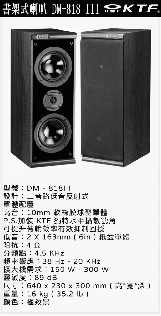 KTF DM-818Ⅲ 黑色 二音路低音反射式書架喇叭一對