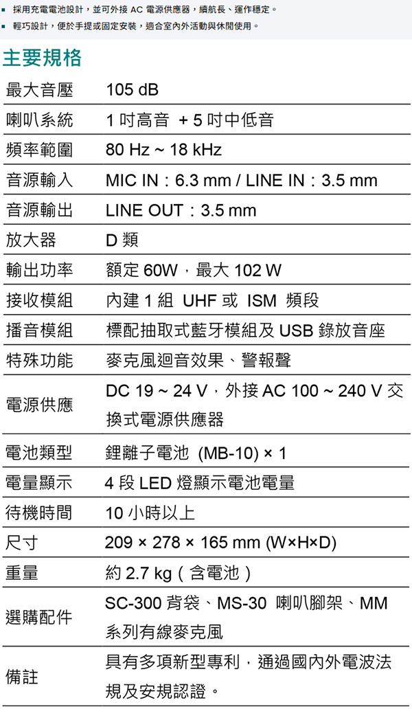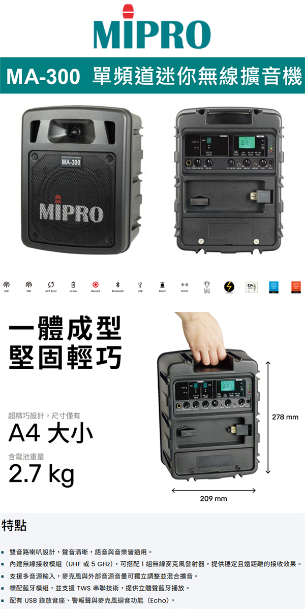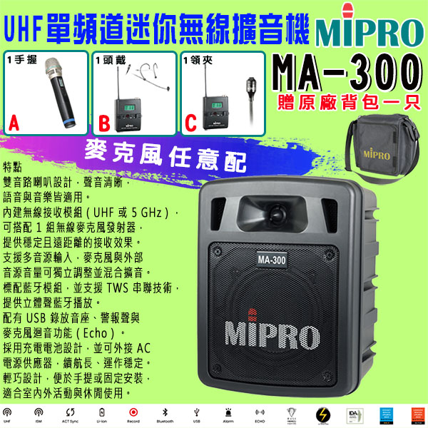 【MIPRO】MA-300 單頻道迷你無線擴音機UHF (ACT-32H 配件三擇一)