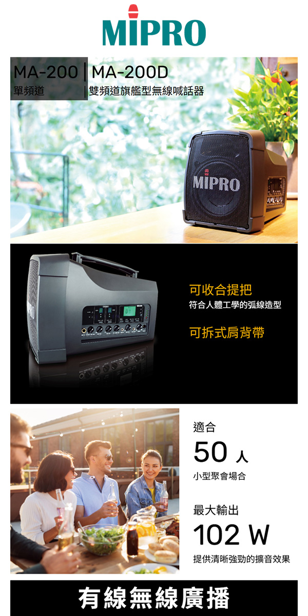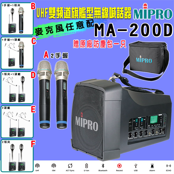 【MIPRO】MA-200D雙頻道旗艦型無線喊話器UHF (ACT-32H 配件六擇一)