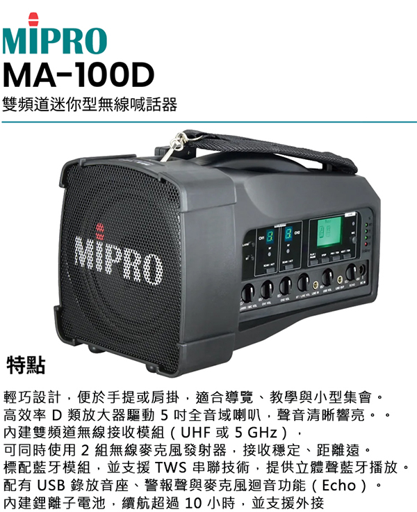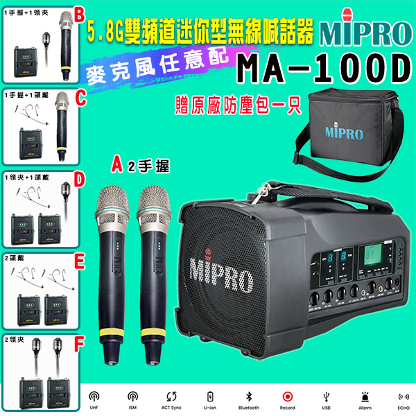 【MIPRO】MA-100D 雙頻道迷你型無線喊話器5.8G(ACT-58H 配件六擇一)