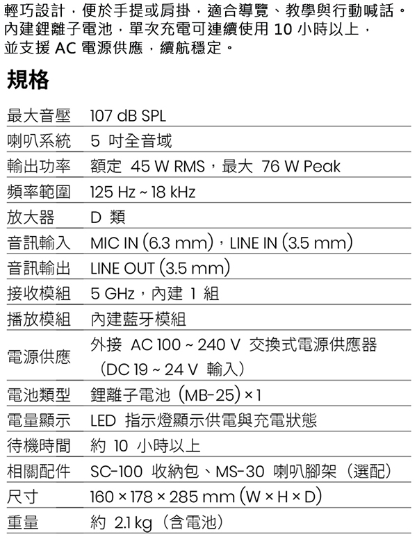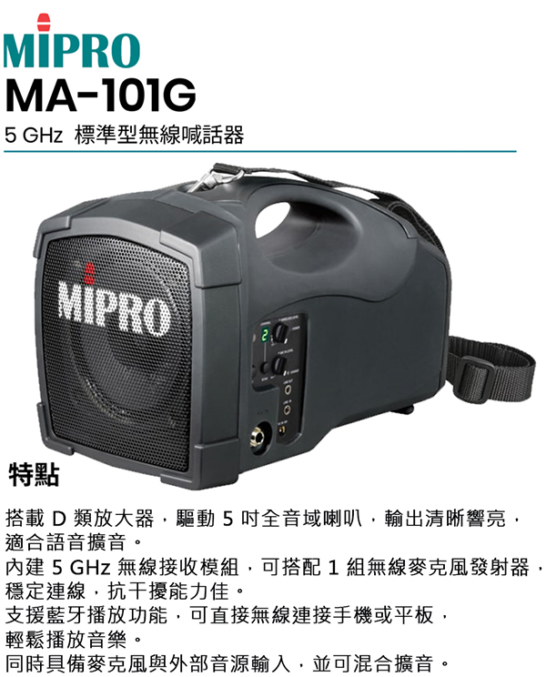 【MIPRO】MA-101G 標準型無線喊話器5GHz(ACT-58H 配件三擇一)