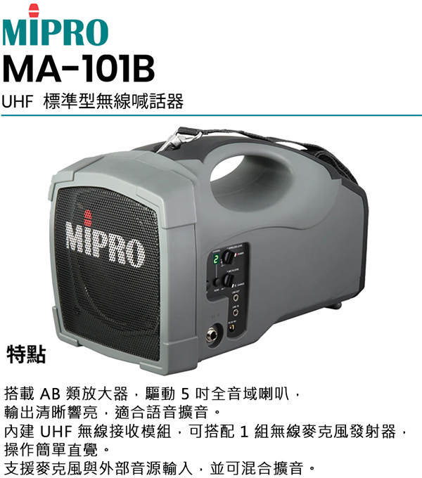 【MIPRO】MA-101B 標準型單頻道無線喊話器UHF (ACT-32H 配件三擇一)