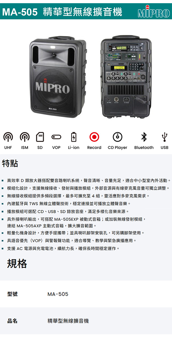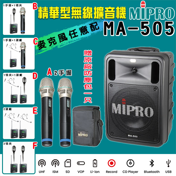 【MIPRO】MA-505 雙頻道精華型無線擴音機UHF(ACT-32H 配件六擇一)