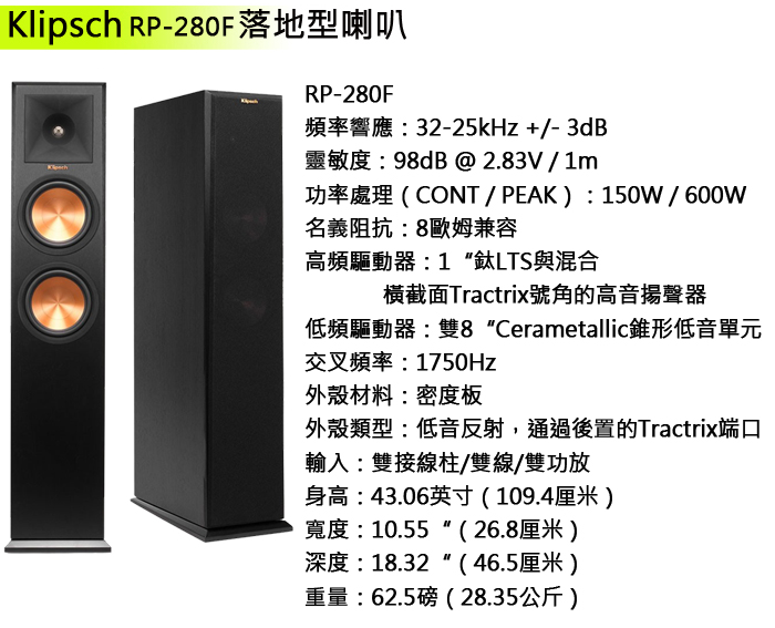 永悅音響 Klipsch RP-280F 落地型喇叭 (對) 全新釪環公司貨 (免運)