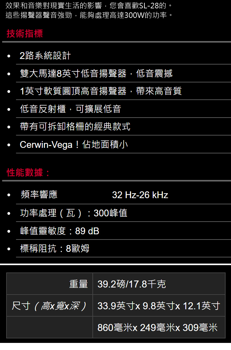 永悅音響CERWIN-VEGA SL-28(對)雙8吋三音路落地型喇叭全新公司貨(免運)