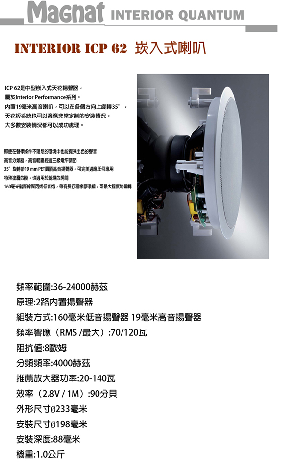 Magnat Interior ICP62 崁入式喇叭(一對)不含電壓器