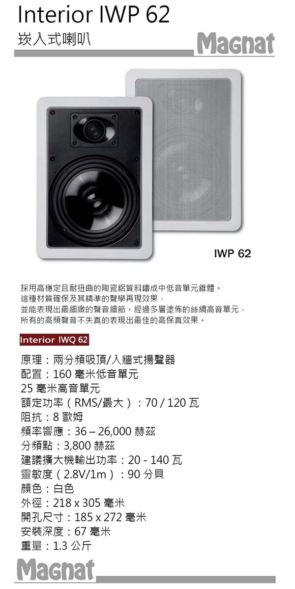 Magnat Interior IWP62 崁入式喇叭(一對)含變壓器