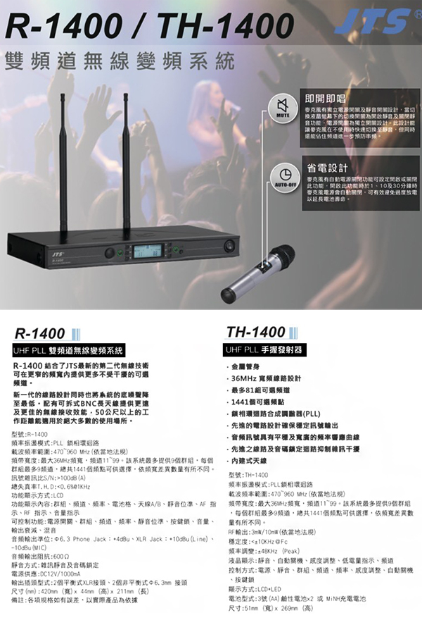 JTS 得琦電子 R-1400 無線麥克風(UHF PLL雙頻道無線變頻麥克風)